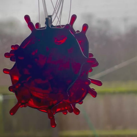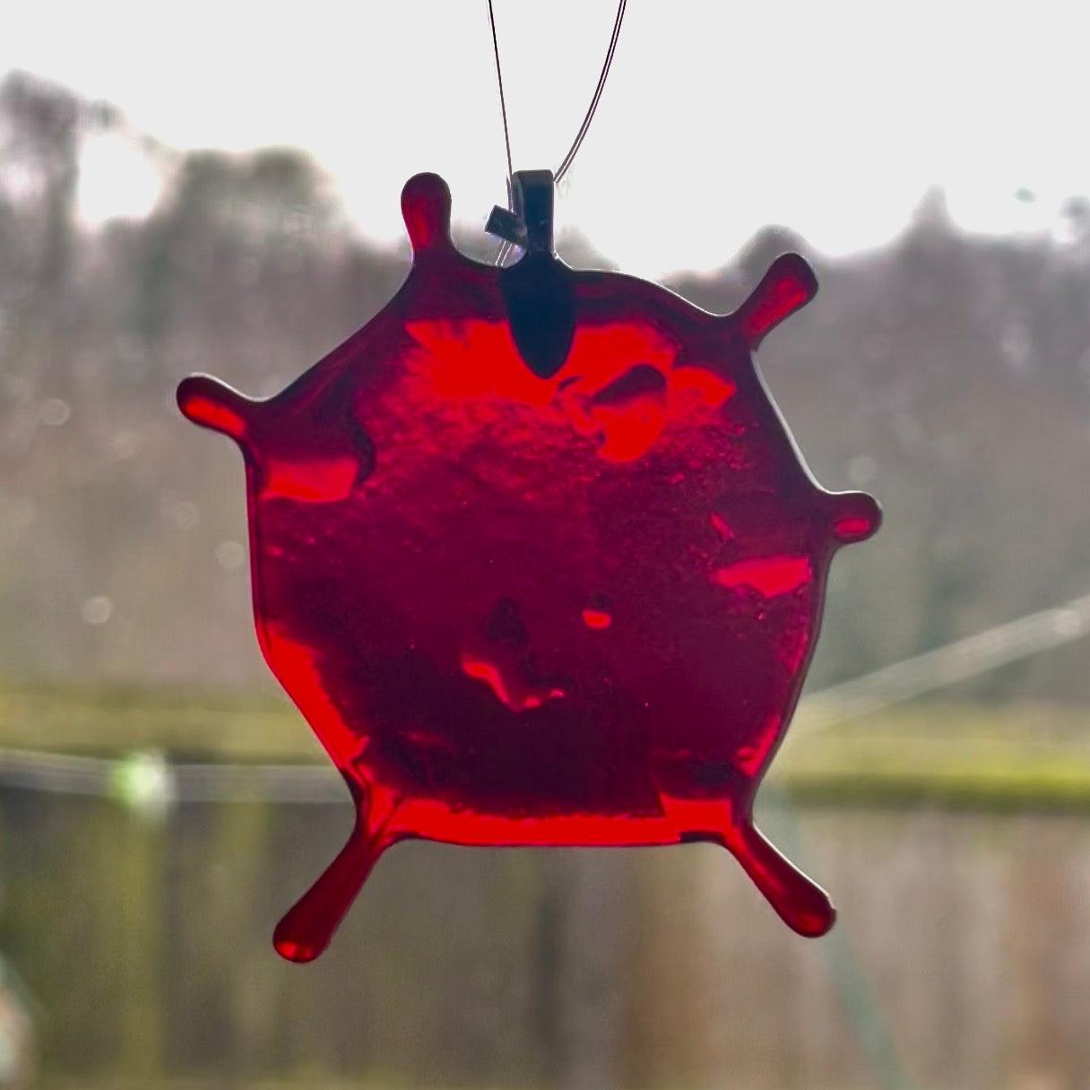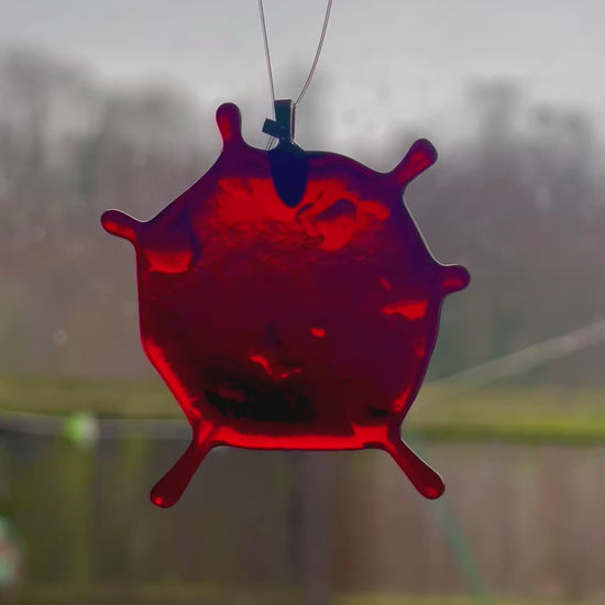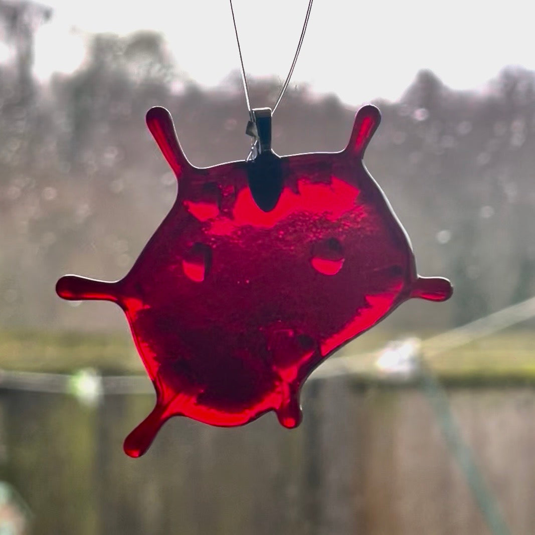 These fused glass blood splatter decorations are all unique in their shave and measure roughly 2.5 inches.