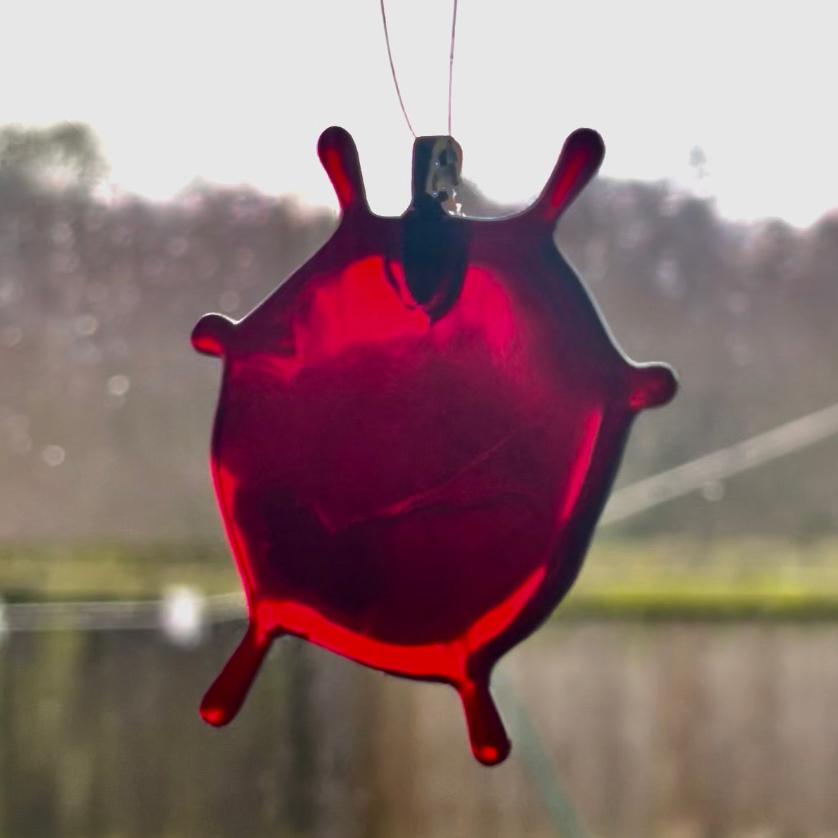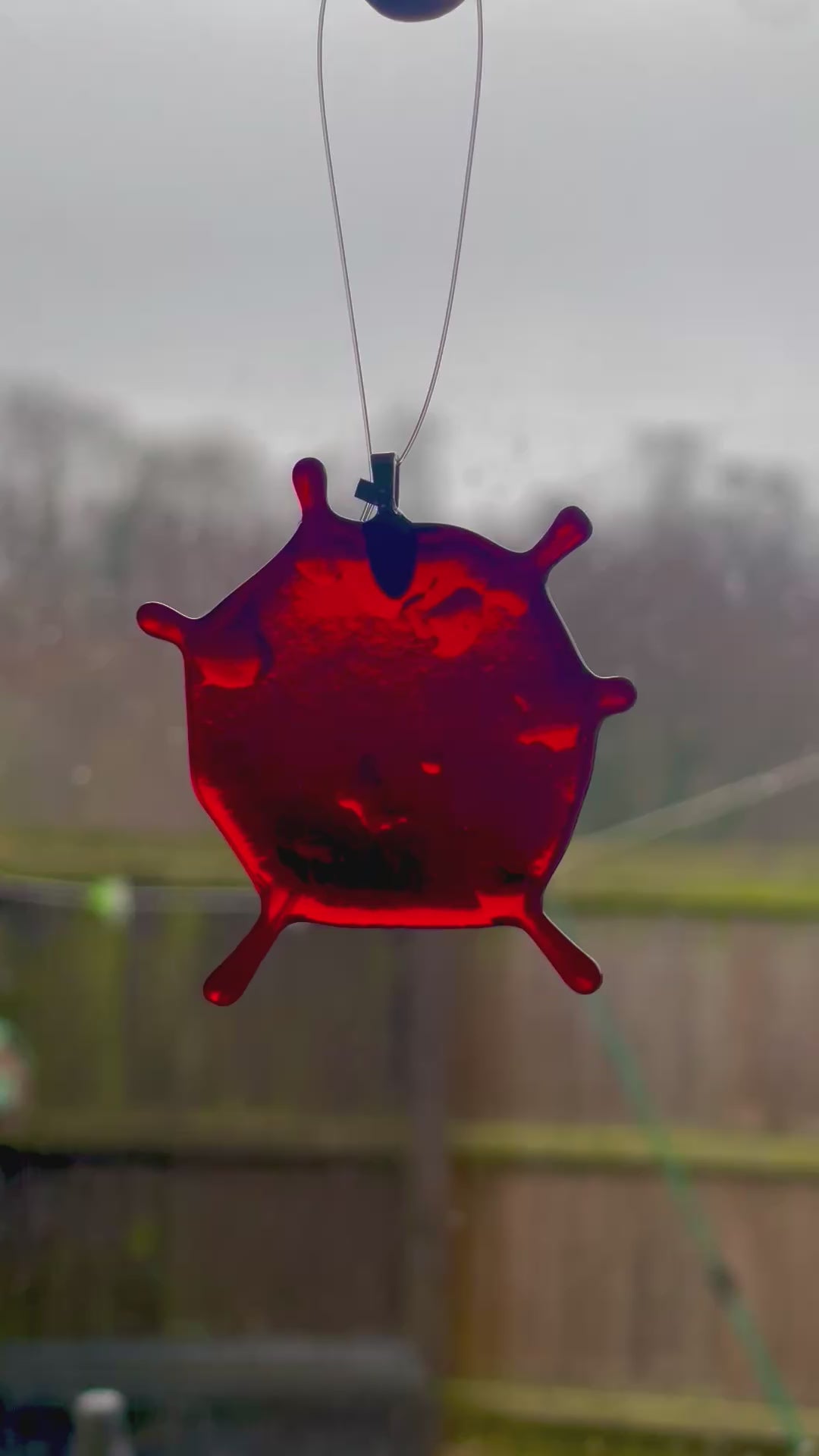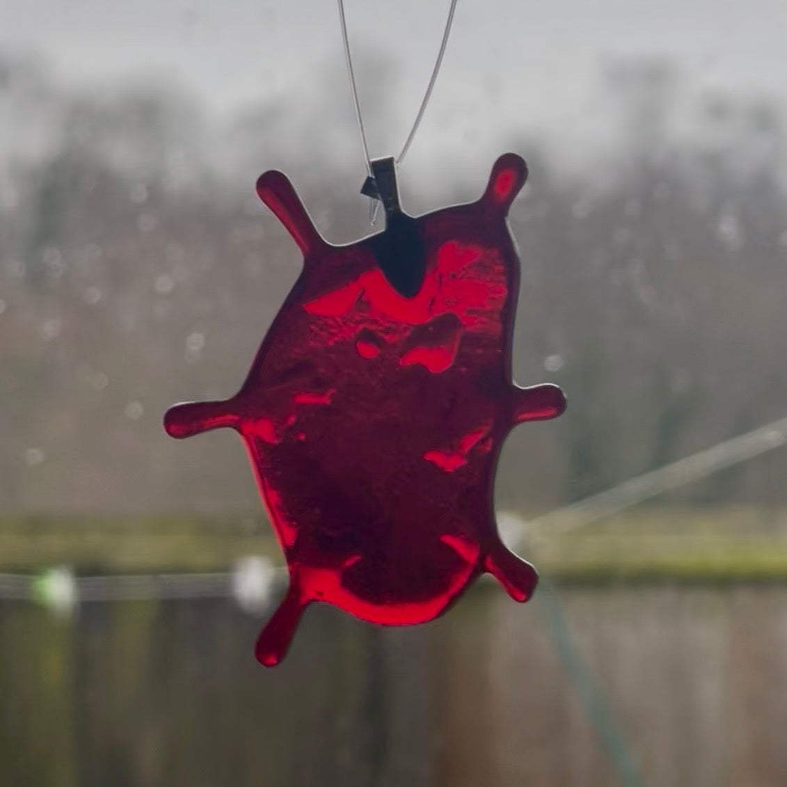 These fused glass blood splatter decorations are all unique in their shave and measure roughly 2.5 inches.